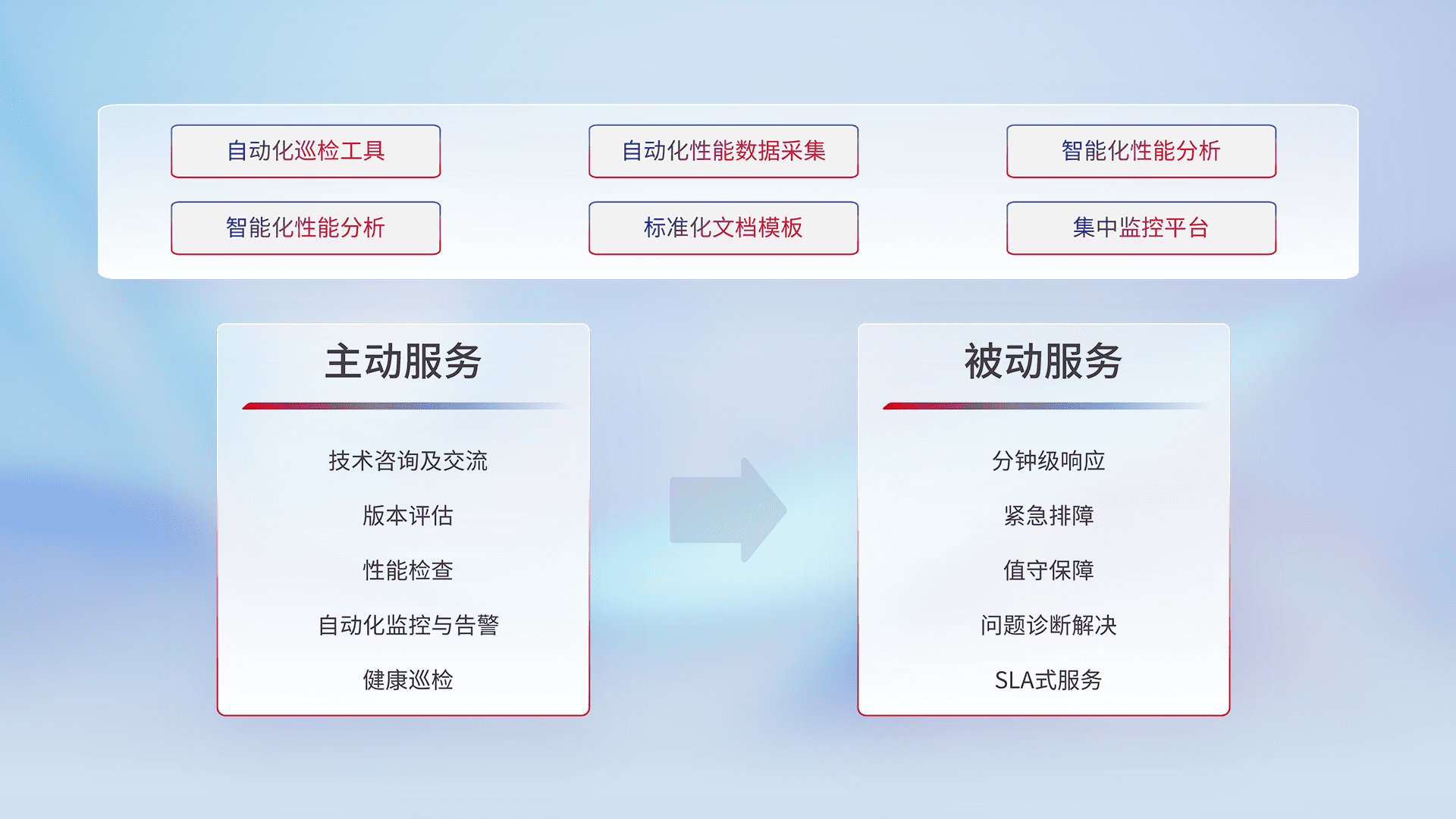 智能化工具和标准化文档,,,保障服务质量,,提供主动服务(包含技术咨询、、版本评估、、、、性能检查、、、、自动化监控与告警、、、健康巡检)和被动服务包含(分钟级响应、、紧急排障、、、值守保障、、问题诊断解决、、、、SLA服务)。。